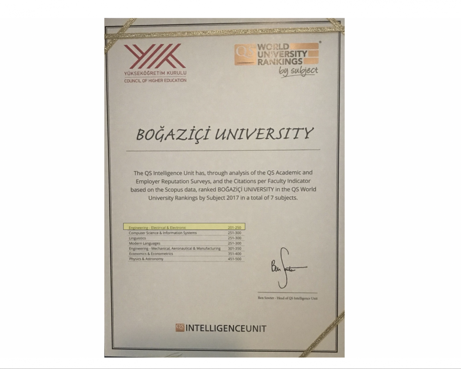 Boğaziçi University is listed among 10 universities from Turkey to be included in the top 400 of Quacquarelli Symonds’s (QS) worldwide university rankings. The university received an award from the Higher Education Council of Turkey for major success in seven research fields. Department of Electrical and Electronics Engineering is listed at the top of Boğaziçi University QS rankings.